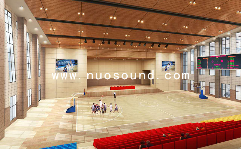 一般來說,多功能體育館建筑聲學設計的基本要求是要達到足夠的響度、滿意的清晰度、全場有比較均勻的效果以及無回聲干擾等物理缺陷,除了基本的設計之外,吸音材料的選擇也很重要。諾聲聲學向校方推薦的產(chǎn)品是諾聲體育館孔木吸音板。